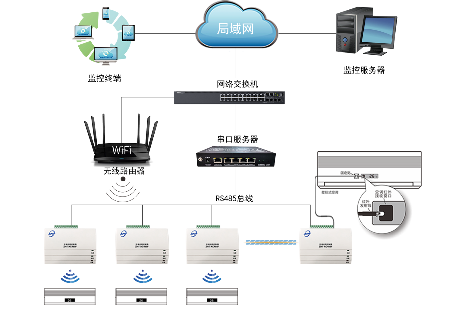 ZHT-AC485F空調遠程控制器內置WiFi通訊模塊和RS485通信接口,可直接使用WiFi連接進行空調控制器的參數配置及數據采集,同時對于有線連接便捷的場景,也可直接使用485總線連接,實現空調的遠程集中控制、安裝維護簡單方便,其系統組網圖如左側所示。