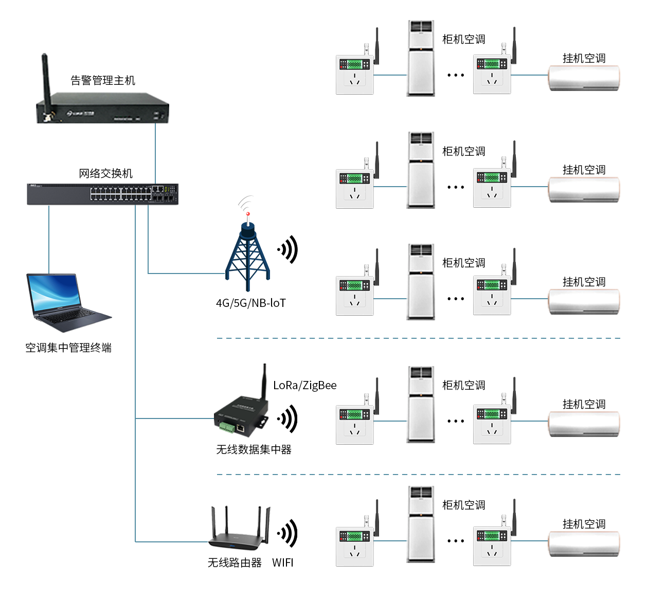 ACsmart系列無線空調(diào)控制器,可選配不同類型的通訊模塊,支持包括:WiFi、LoRa、ZigBee、NB-IoT、4G/5G等無線通信方式,空調(diào)控制器聯(lián)網(wǎng)成功后,空調(diào)集中管理中心即可實時監(jiān)測所有空調(diào)的開啟狀態(tài)、運行參數(shù)以及用電詳情等信息,同時支持遠程控制所有在網(wǎng)空調(diào),支持"一鍵"操作批量空調(diào),譬如:一鍵開/關(guān)機、設(shè)定統(tǒng)一運行溫度、系統(tǒng)自動調(diào)度聯(lián)動指定空調(diào)等功能。